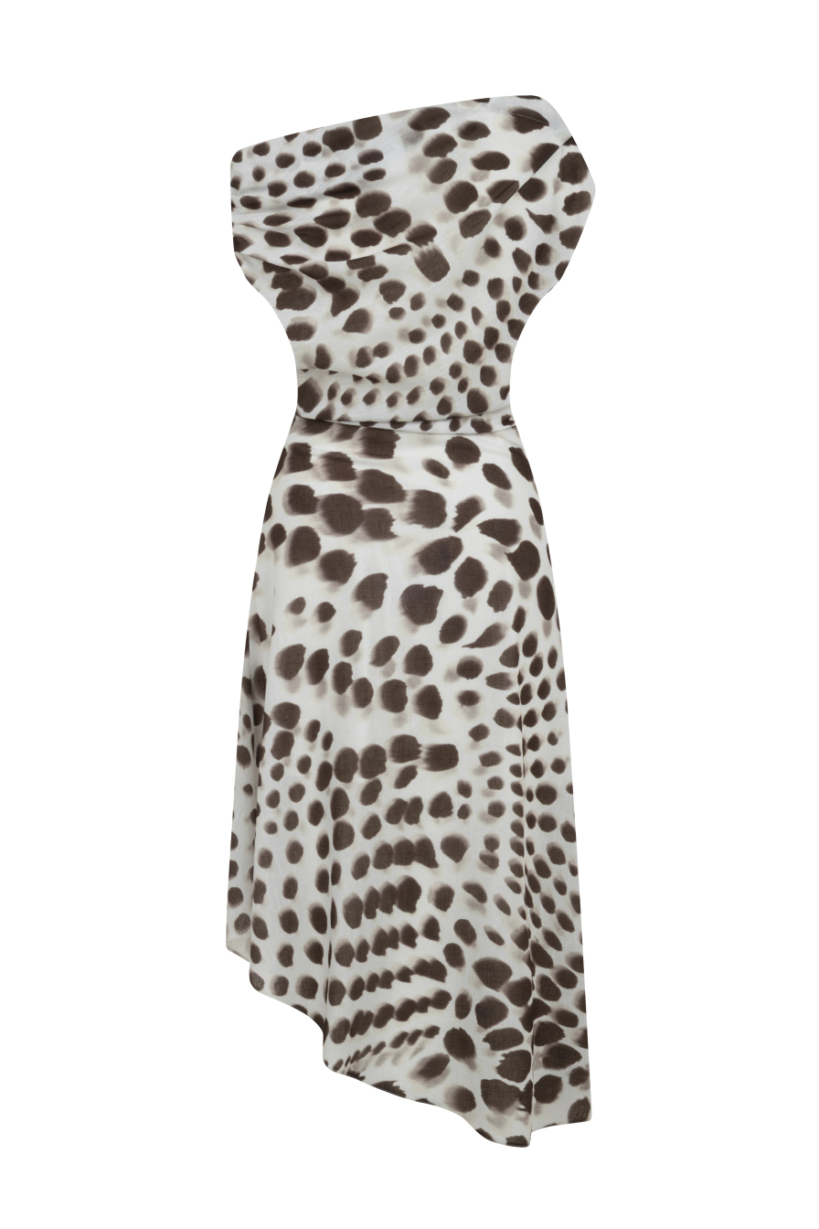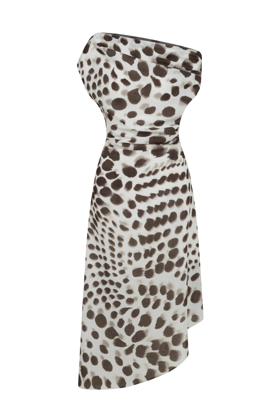 Düşük Omuzlu Kahverengi Leopar Desenli Midi Elbise