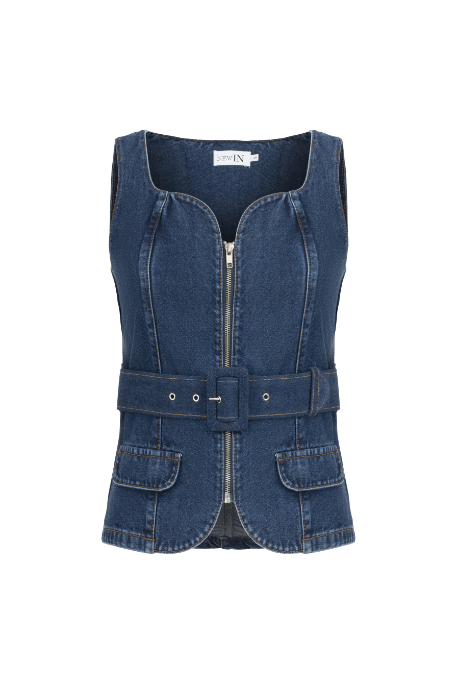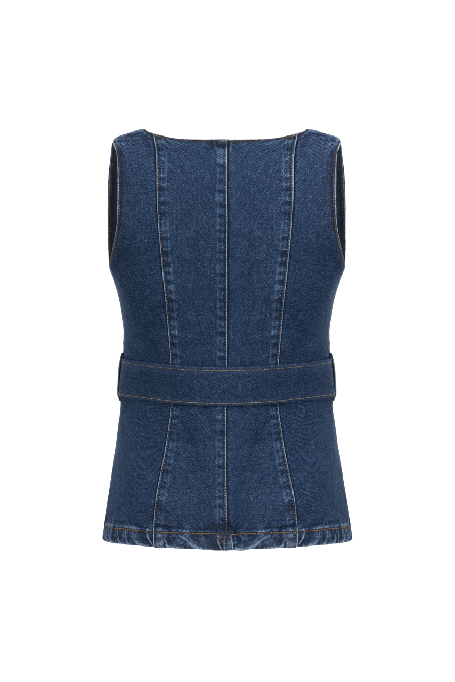 Kemerli Lacivert Denim Yelek